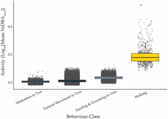 Mean activity level (VeDBAmax; m·s−2) associated with each behavioural category, pooled across all koalas (n = 9) and days. Solid black lines indicate the median, boxes represent the interquartile range, error bars represent 1.5 × IQR, and grey points show the data points. All behavioural categories differ significantly from one another (p < 0.001).
