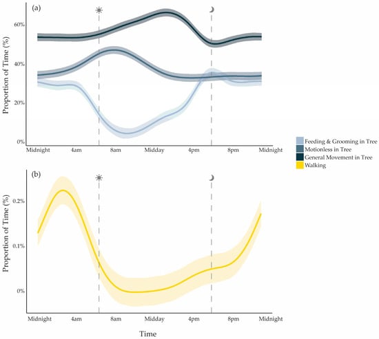 Modelled proportion of time spent in (a) arboreal behavioural categories and (b) Walking over a 24 h period, averaged across all koalas (n = 9). Lines show GAM-predicted values with shaded ribbons indicating 95% confidence intervals (CIs).