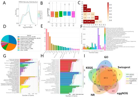 Distribution of gene expression levels among different samples based on the samples’ FPKM matrices: (A) Plotting of density distribution curves based on FPKM from each sample; (B) Plotting of boxplots based on FPKM from each sample; (C) Heatmap of correlations among samples, in which the darker the color and the closer the value to 1, the more similar the gene expression patterns are among the samples. Annotation of genes to multiple biological databases: (D) Query of all genes against the Non-Redundant Protein Sequence Database (NR) and Swiss-Prot Protein Knowledgebase (Swiss-Prot) databases; (E) Matching of all genes to the Transcription Factor (TF) Database; (F) Annotation of all genes to the EggNog database; (G) Annotation of all genes to the Kyoto Encyclopedia of Genes and Genomes (KEGG) database; (H) Mapping of all genes to the three ontologies of the Gene Ontology (GO) database; (I) All genes with overlapping annotations via cross-referencing to the GO, KEGG, NR, EggNOG, and Swiss-Prot databases.