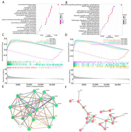 Enrichment analysis of differential gene sets to screen out key pathways and biological processes: (A) Gene Ontology (GO) enrichment analysis of DEGs in the female and male gonads of H. guttatus; (B) The most enriched KEGG pathway from DEGs in the gonads of female and male H. guttatus; (C) GSEA-GO enrichment analysis of DEGs in the female and male gonads of H. guttatus; (D) GSEA-KEGG enrichment analysis of DEGs in the female and male gonads of H. guttatus; (E) A regulatory network composed of DEGs annotated to the TGF-beta signaling pathway. spherical shapes represent proteins, connecting lines represent the interaction relationships between two proteins, and green spherical proteins are the core proteins in the STRING regulatory network; (F) A regulatory network composed of DEGs annotated to the GnRH signaling pathway. Spherical shapes represent proteins, lines represent the interaction relationships between two proteins, and spherical proteins in red are the core proteins in the STRING regulatory network.