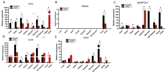 Relative expression of sex-related genes in various tissues of H. guttatus: (A) Relative expression of the myc gene in various tissues of H. guttatus; (B) Relative expression of the rbm46 gene in various tissues of H. guttatus; (C) Relative expression of the angptl4 gene in various tissues of H. guttatus; (D) Relative expression of the sox9 gene in various tissues of H. guttatus; (E) Relative expression of the fzd2 gene in various tissues of H. guttatus. Asterisks indicate significant differences in gene expression (p < 0.05).