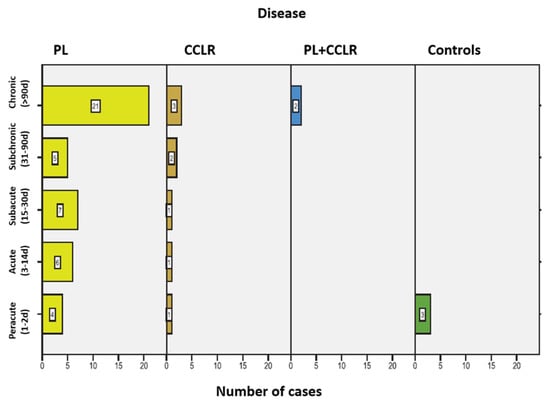Frequency of lameness duration among the dogs in the study, including the associated conditions for each duration category. Abbreviations: Patellar luxation—PL; Cranial cruciate ligament rupture—CCLR.