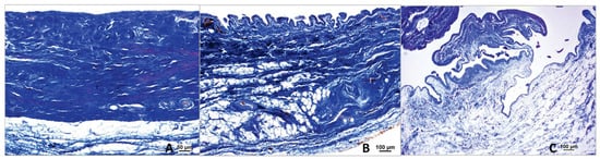 All joint capsule samples were prepared at the Institute for Veterinary Anatomy (Center for Biomedical Sciences, School of Veterinary Medicine, Freie Universität Berlin) following the guidelines of Mulisch and Welsch [13]. This standardized procedure included fixation, dehydration, embedding, and sectioning, ensuring optimal preservation for microscopic examination. Samples were stained using four histological techniques and analyzed under light microscopy multiple times (Supplementary Table S2).