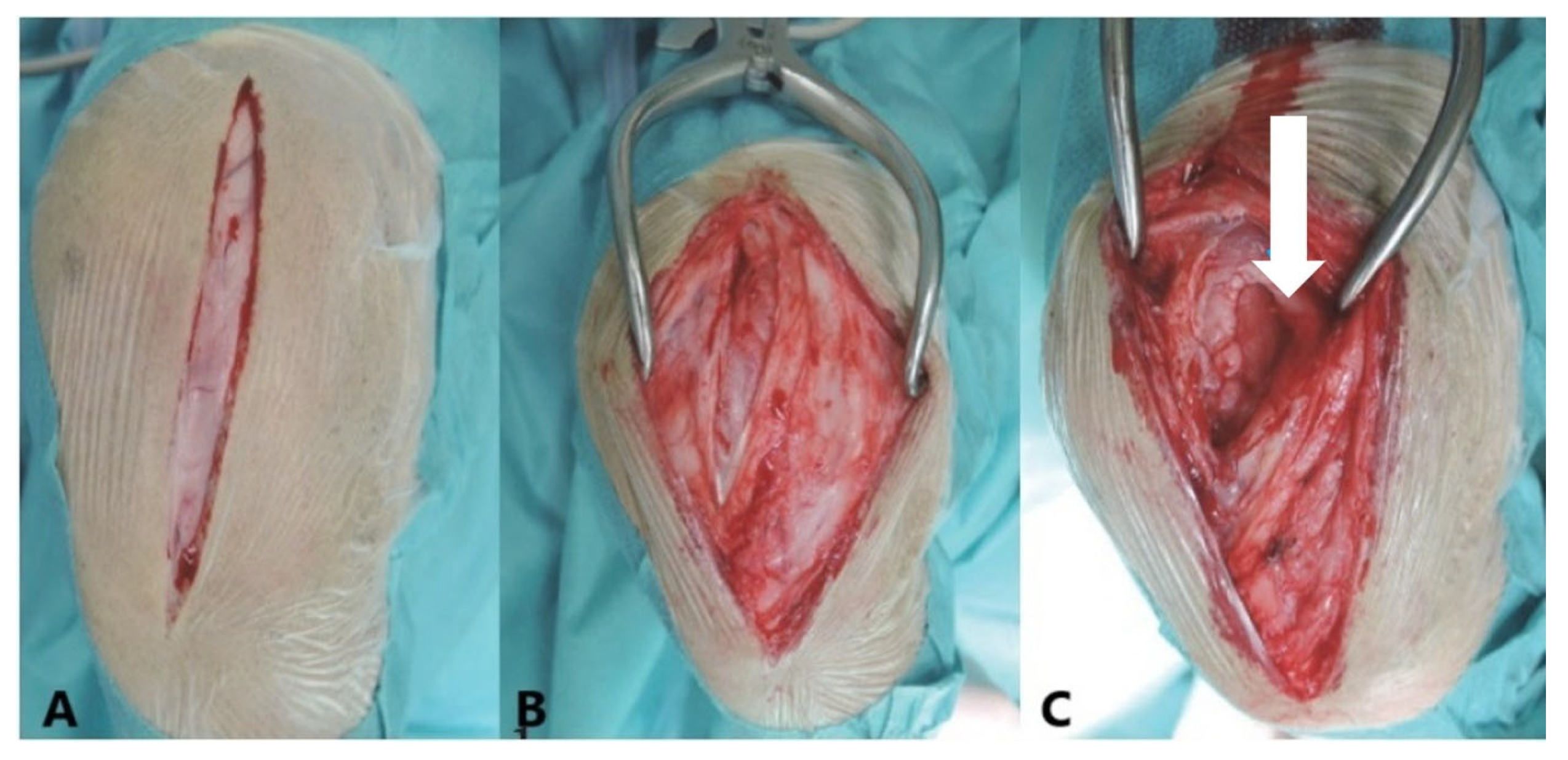 18]. Consequently, lateral capsular imbrication was performed to tighten the joint capsule on the lateral side, also for CCLR cases. In terms of sample collection, the stifle joint, whether right or left, was routinely exposed laterally via a parapatellar approach [