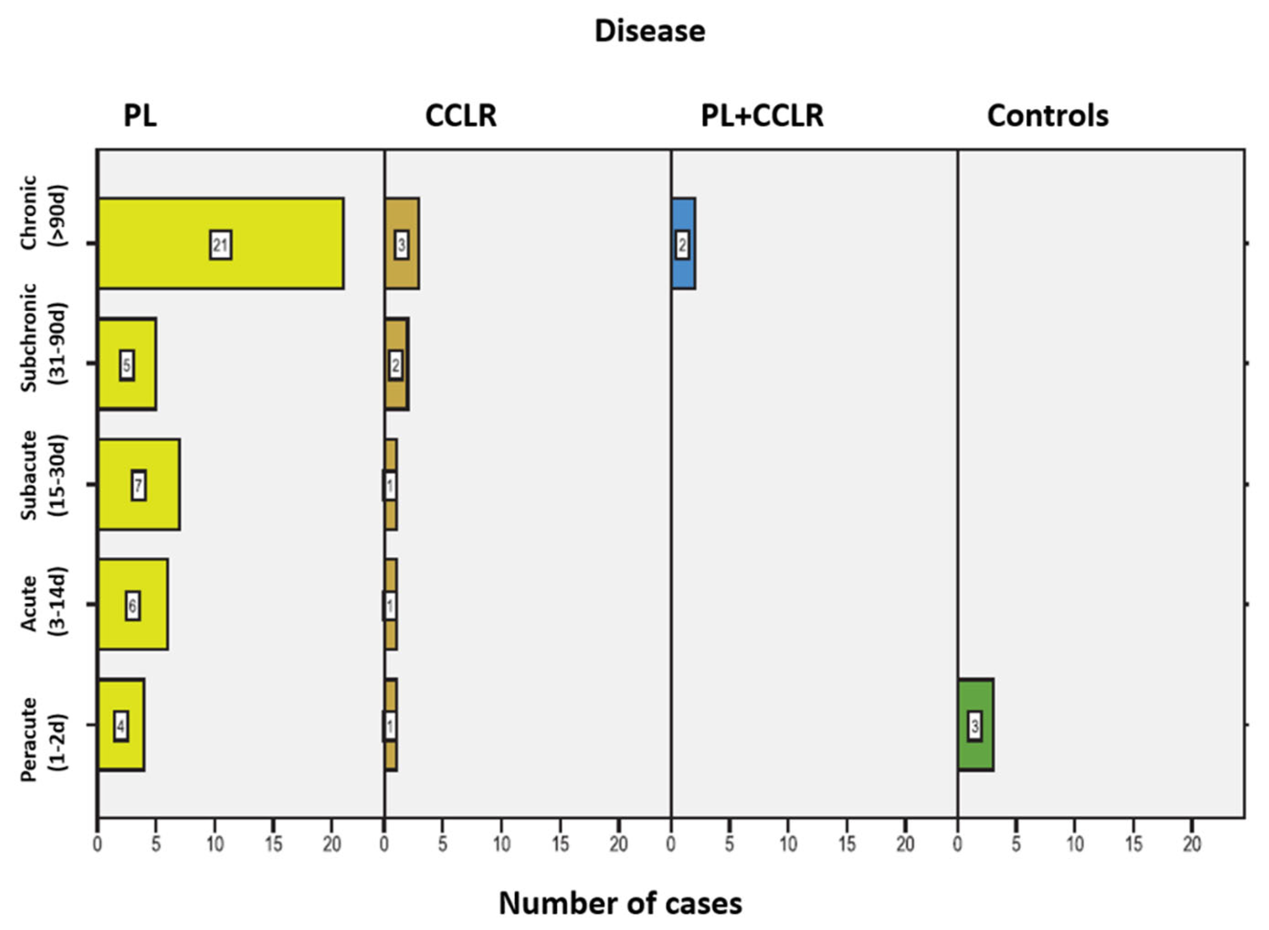 Figure 5. In 20 patients (25.64%), the owners could not provide information on the duration of the lameness. Two control animals were not presented due to lameness but were included in the peracute lameness group.