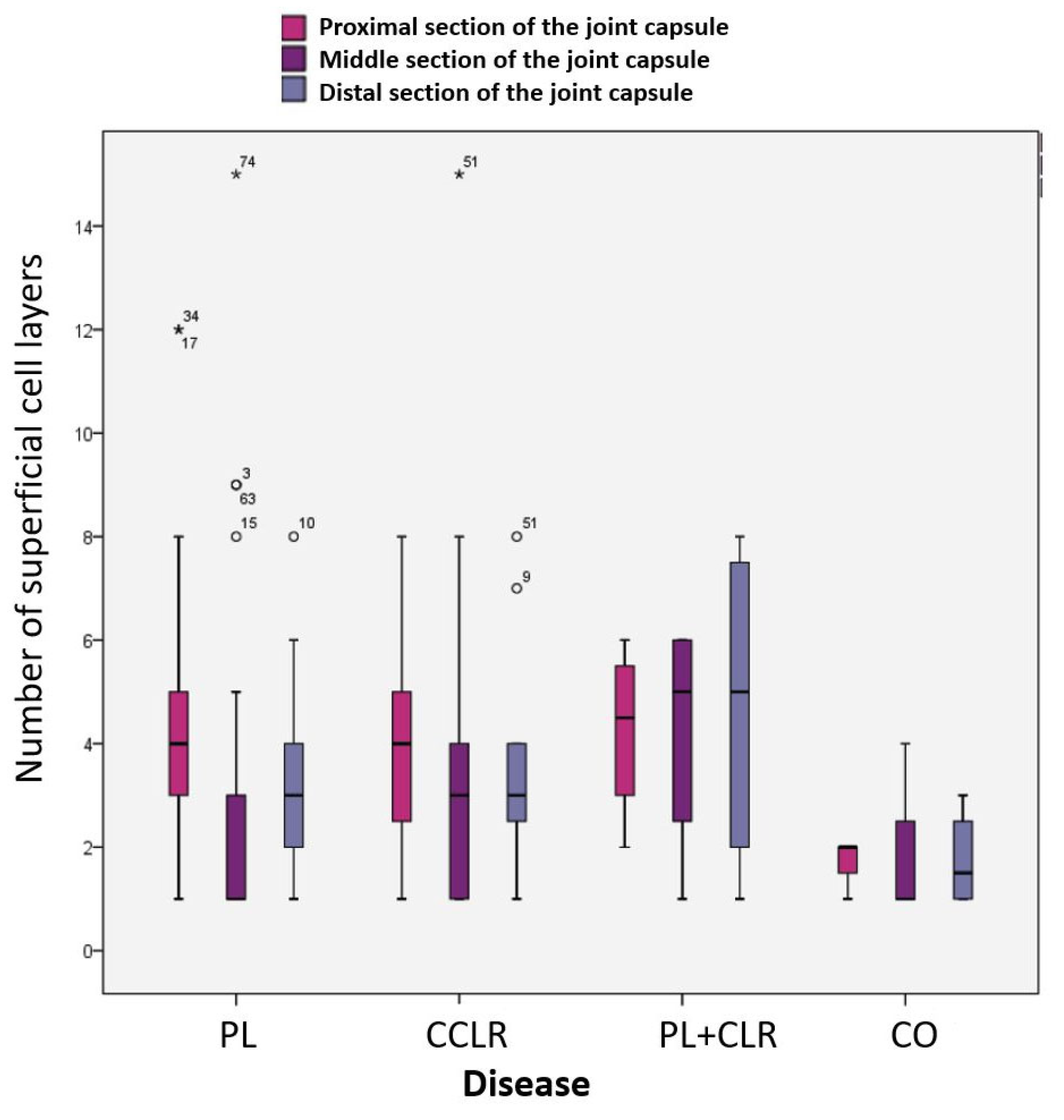 The mean number of superficial cell layers in the proximal joint capsule section was similar among dogs with patellar luxation (mean = 4.03), those with cruciate ligament rupture, and those with both conditions. The mean value was lower in the control group. However, this difference was not statistically significant (