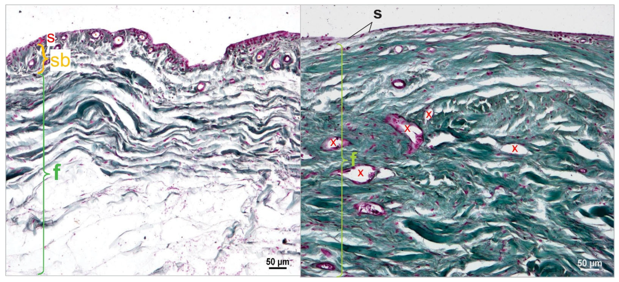 During the histomorphological examinations, it was observed that the stratum subsynoviale was absent in the middle section of the stifle joint capsule samples in 59 out of 78 cases (75.64%). As a result, the stratum synoviale was directly adjacent to the stratum fibrosum. This phenomenon was not observed in the proximal and distal sections of the joint capsule, where all three layers were always present (
