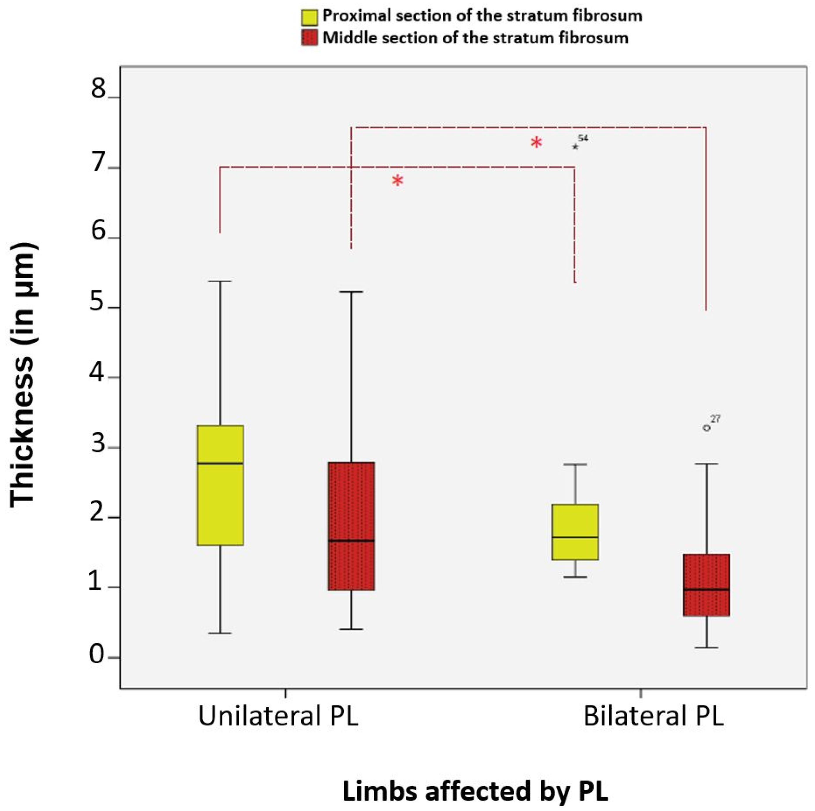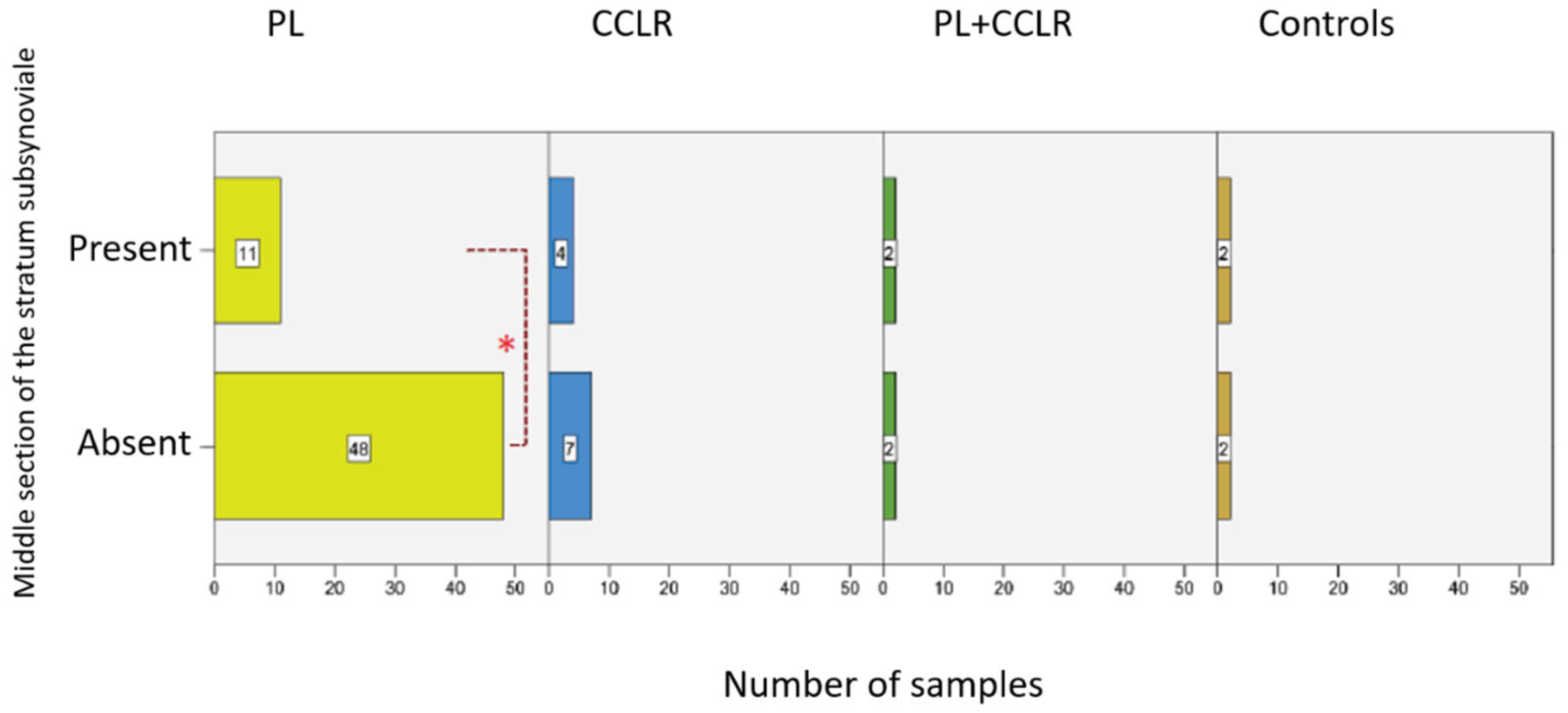The absence of the stratum subsynoviale has not been explicitly documented in the existing literature. However, in 59 out of 78 cases (75.64%), the stratum subsynoviale in the middle section of the stifle joint was undetectable, representing a significant finding. In these cases, the stratum synoviale directly adjoined the stratum fibrosum, while all three layers were detectable in the proximal and distal sections of the same sample. Notably, dogs with PL were significantly more likely to lack the stratum subsynoviale in the middle section, with 81.36% (n = 44) affected, compared to 63.64% (n = 7) of dogs with CCLR.