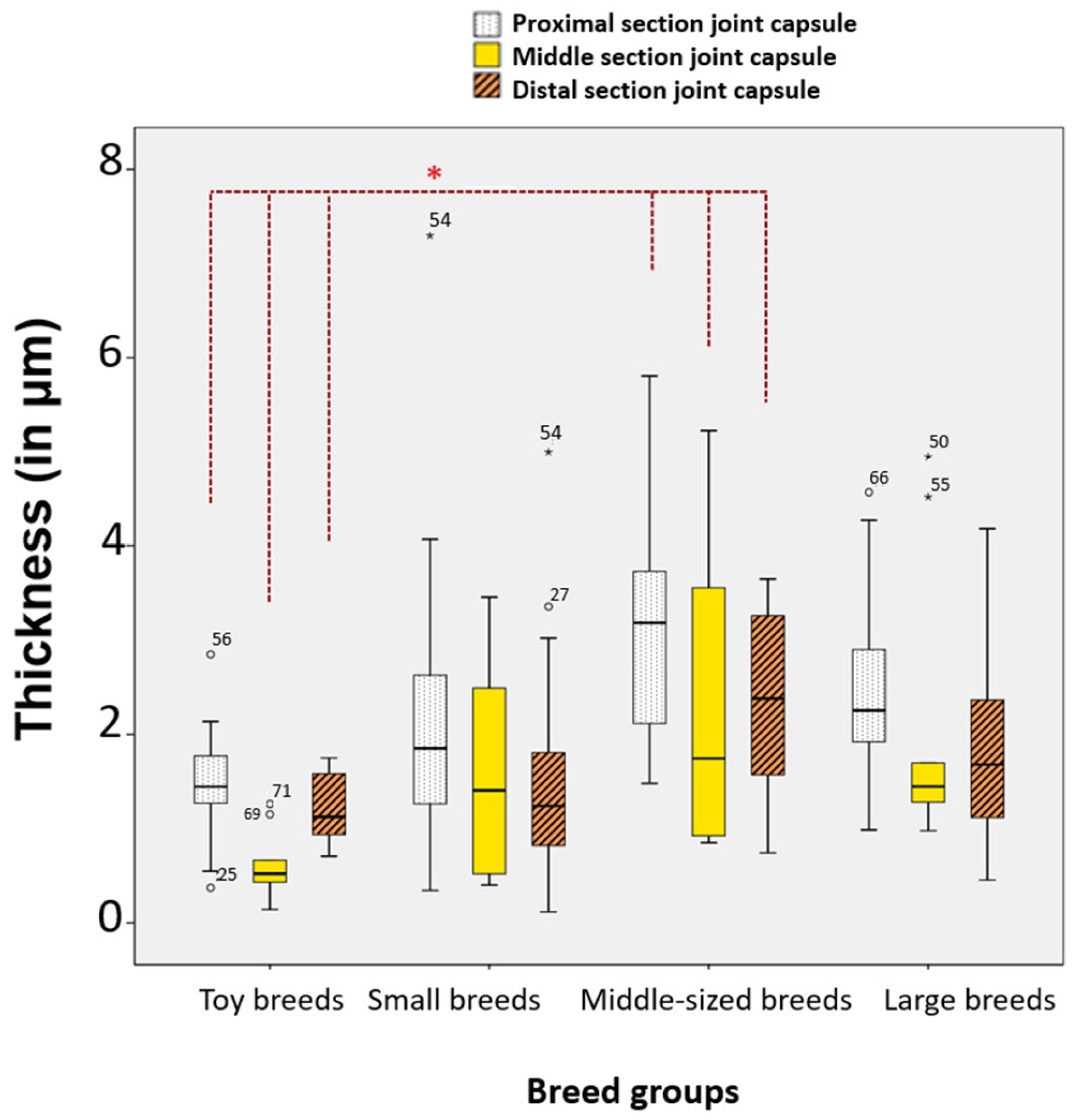 Significant differences in joint capsule thickness were observed among breed groups, with toy dogs showing a thinner proximal section compared to medium and large breeds, and a thinner middle section relative to all other groups.