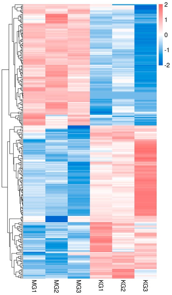 The average body weight of the fast-growing group (FGM) was significantly higher than that of the slow-growing group (SGM), with an average weight of 731.36 ± 69.87 g for FGM and 128.56 ± 6.48 g for SGM (p < 0.01). This significant difference in body weight confirmed the distinct growth rates between the two groups, indicating that the experimental design effectively captured the variation in growth performance.