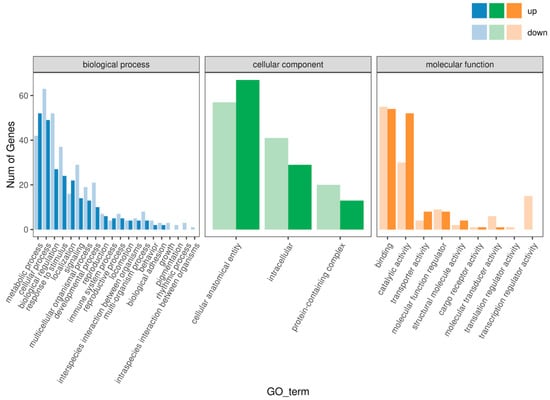 Gene ontology (GO) enrichment analysis revealed that the DEGs were primarily involved in metabolic processes, cellular processes, biological regulation, and response to stimulus. In the cellular component category, the DEGs were enriched in cell structures, intracellular components, and protein-containing complexes. In the molecular function category, the DEGs were mainly annotated to binding, catalytic activity, transporter activity, and other functions (Figure 3). These results suggest that the differences in growth rates between the FGM and SGM groups are associated with variations in cellular metabolism and regulatory mechanisms.