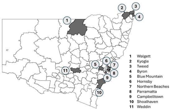 Geographic location of 11 councils in New South Wales, Australia, participating in the KCSAH project.