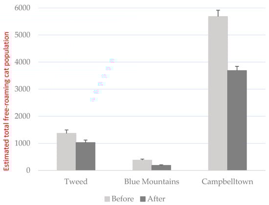 Free-roaming cat population estimates before and after the Keeping Cats Safe at Home project in the Tweed, Blue Mountains, and Campbelltown local government areas.