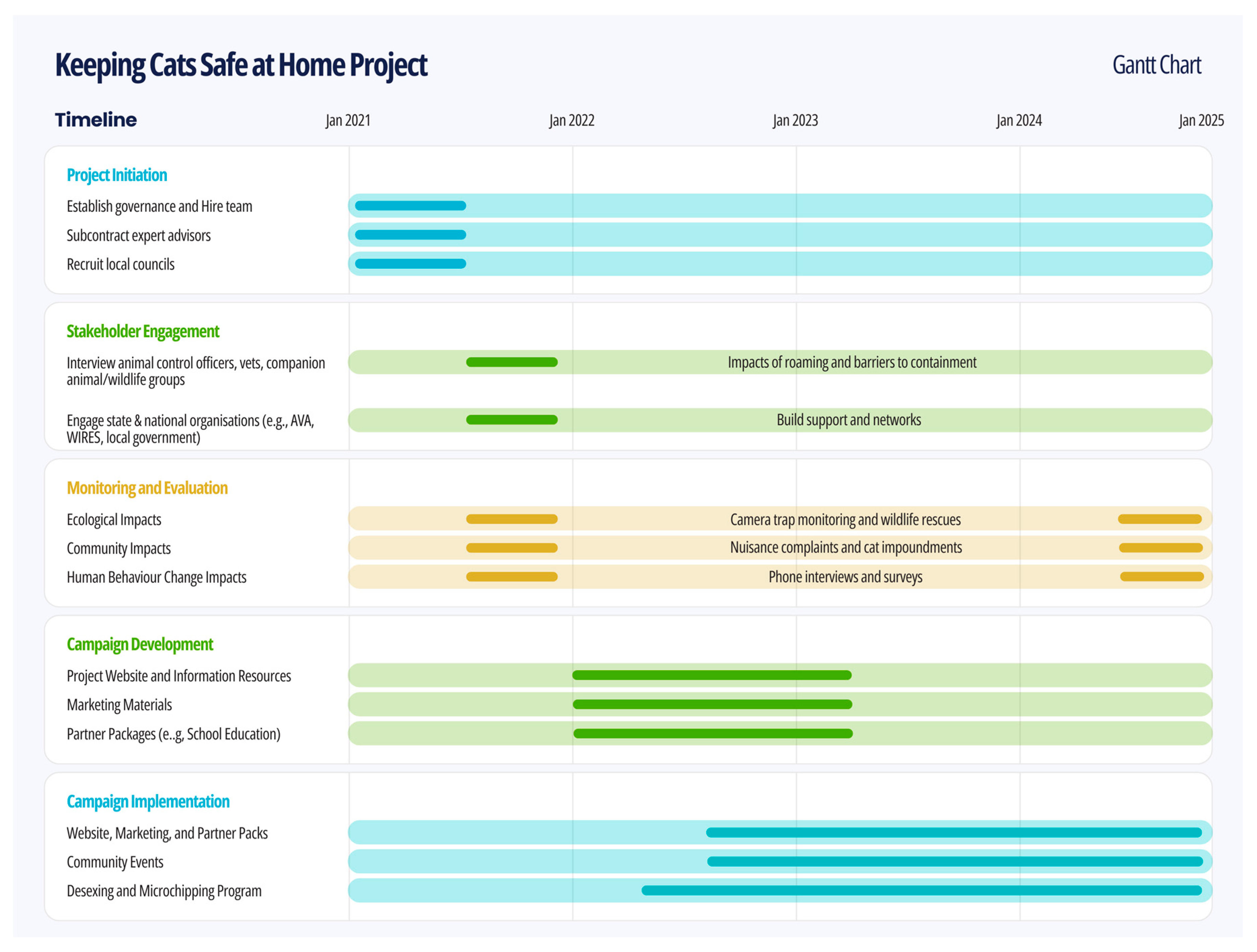 | Reduction in nuisance cat complaints to councils | 20% reduction | Reductions in Campbelltown (−64%), Parramatta (−51%), Hornsby (−47%), Northern Beaches (−61%); increases in Blue Mountains (+78%), Byron (+36%) | Complaint data collection varied between councils. |