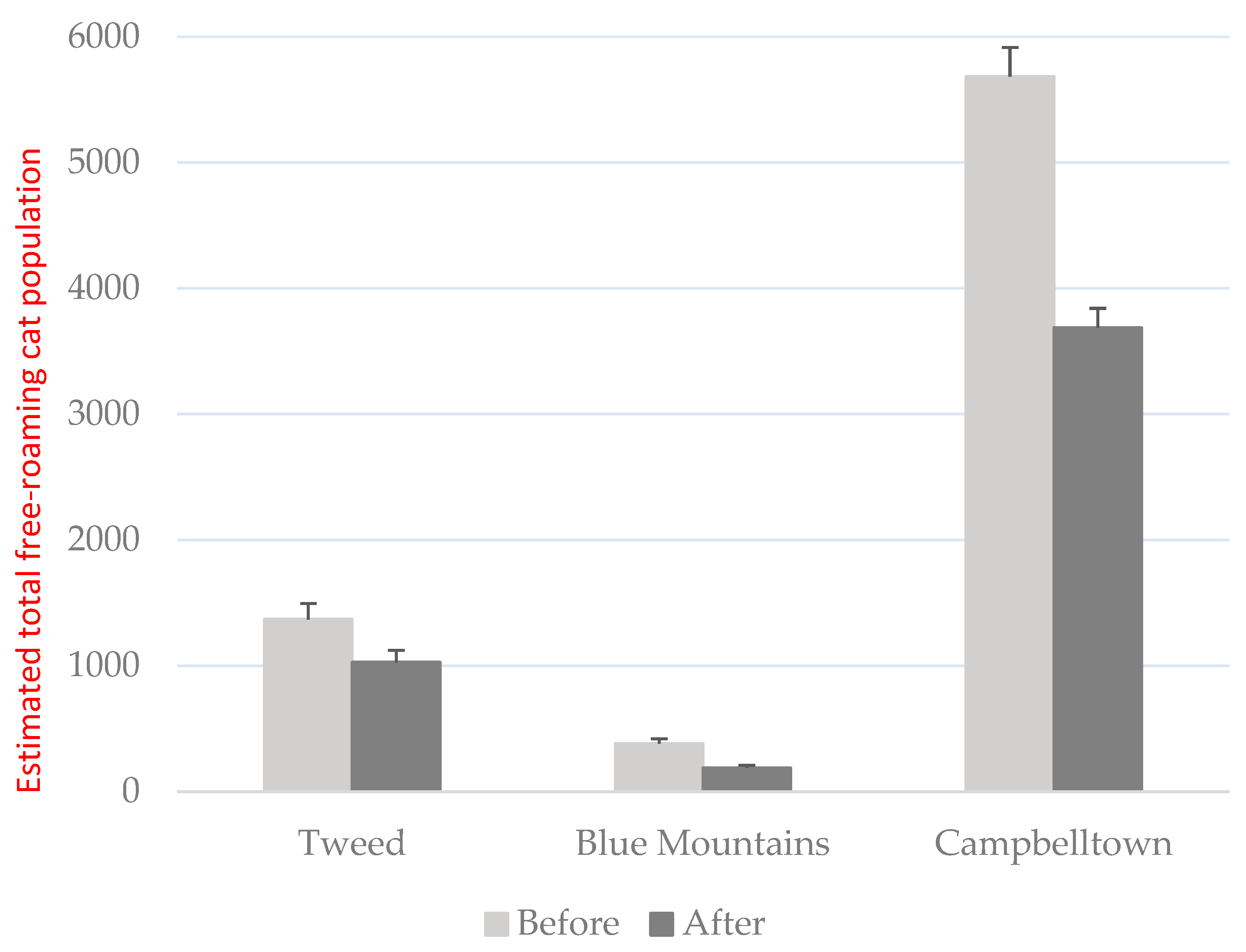 - Davey, I.J.; Westman, M.E.; Van der Saag, D.; Ma, G.C.; Kennedy, B.P.A. Spatial and Temporal Movements of Free-Roaming Cats and Wildlife in Two Local Government Areas in Greater Sydney, Australia. Animals 2023, 13, 1711. [Google Scholar] [CrossRef] [PubMed]