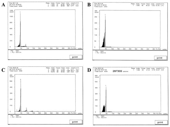 Cytometric histograms of DNA fluorescence for BSB, TC, and BTBTF1-F2. (A) The mean relative fluorescence intensity of BSB (peak 1: 45.98). (B) The mean relative fluorescence intensity of TC (peak 1: 46.28). (C) The mean relative fluorescence intensity of BTBTF1 (peak 2: 48.05). (D) The mean relative fluorescence intensity of BTBTF2 (peak 1: 47.23).