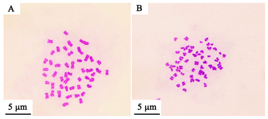 To determine the ploidy levels of BTBTF1-F2, 50 samples each of BSB, TC, BTBTF1, and BTBTF2 were selected for DNA content analysis and chromosome preparation. Venous blood (0.2 mL) was collected from the dorsal vein of each fish and preserved in ACD (Acid–Citrate–Dextrose Solution). Following a previously defined protocol [21], blood samples were stained with 4′6-diamidino-2-phenylindole, and the average DNA content of each sample was measured using a flow cytometer (Cell Counter Analyzer, Partec, North Rhine-Westphalia, Germany). This method aligns with the FAO’s Genomic Characterization of Animal Genetic Resources: Practical Guide [22]. Compared to the average DNA contents of BSB and TC, the deviation of the ratio of DNA content of BTBTF1-F2 to the sum of that of BSB and TC from the expected ratio was detected through χ2 tests with Yates’ correction. Based on this, BSB, TC, BTBTF1, and BTBTF2 individuals, exhibiting no difference in DNA content, were selected for preparing kidney chromosomes following a previously described method [23]. Ten individuals from each fish species were selected for chromosome preparation. Chromosomes in samples that met the following criteria were counted under an optical microscope: clear with distinguishable arm boundaries, clearly visible centromeres, uniform dispersion, no obvious structural aberrations (such as breakage, deletion, and translocation), and the ability to be independently presented., Ten metaphase spreads were observed in each sample, resulting in 100 metaphase spreads recorded for each fish species.