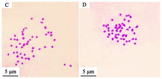 Chromosome spreads during metaphase in BSB, TC, and their hybrid lineage (BTBTF1-F2). (A) Chromosomal spread of BSB. (B) Chromosomal spread of TC. (C) Chromosomal spread of BTBTF1. (D) Chromosomal spread of BTBTF2. Bar = 5 μm.