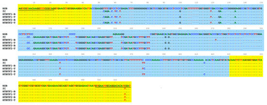 The alignment results of ITS1, partial 18S rDNA, and 5.8S rDNA sequences from BSB, TC, BTBTF1, and F2 are presented. The black-underlined sequences represent primers. The yellow regions indicate partial 18S and 5.8S rDNA sequences, and the blue region denotes the ITS1 sequence.
