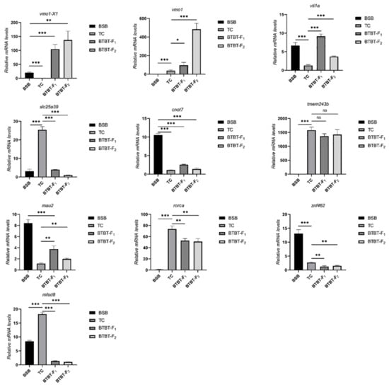 qRT-PCR validation of expression patterns on 10 representative DEGs in the transcriptome of BSB, TC, BTBTF1, and BTBTF2. * represents significant difference, ** and *** represents extremely significant difference, and ns represents no significant difference.