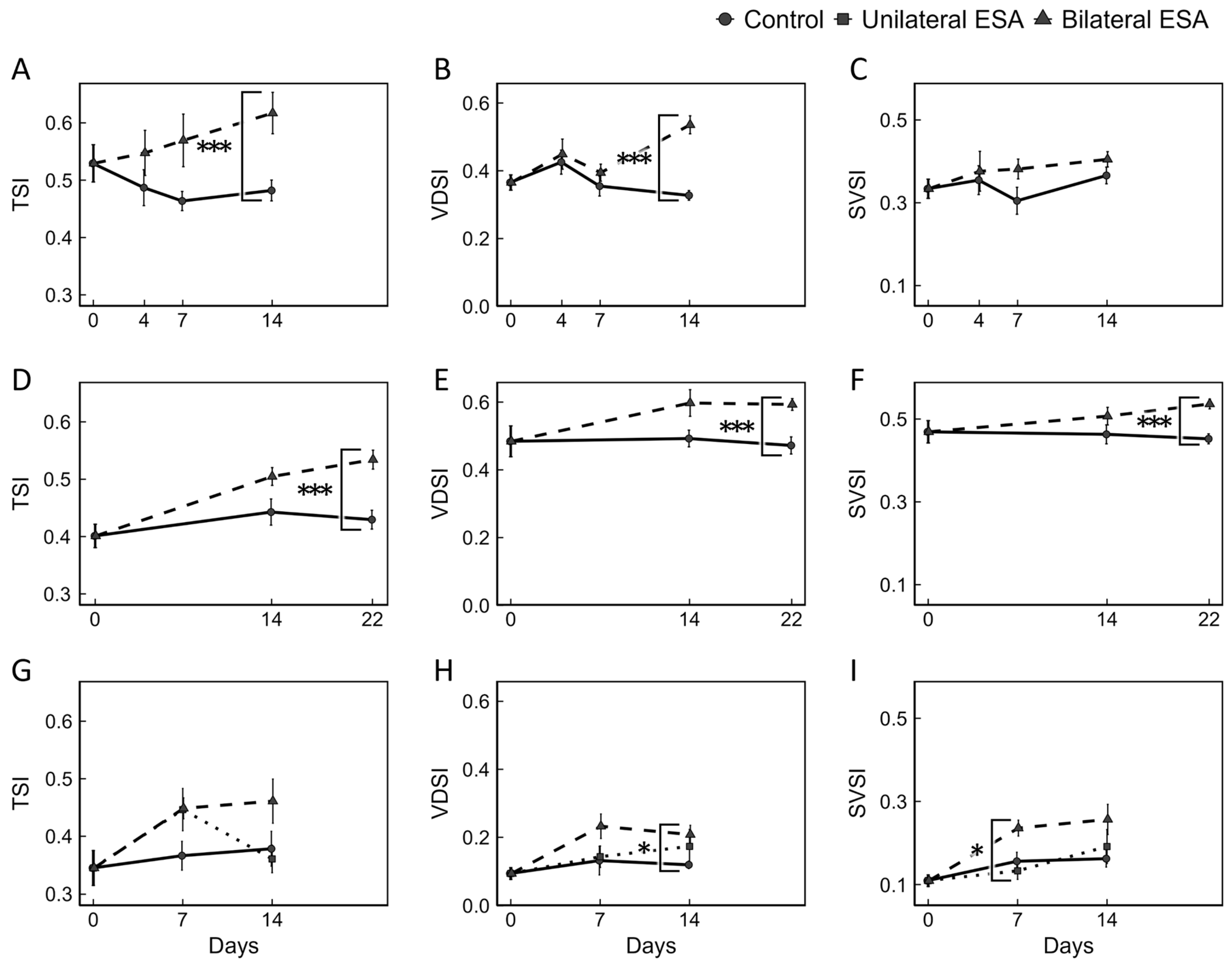 | Exp. 3 (November~ December) | 8.78 ± 1.4 | 18.1 (16.0–19.1) | 2-ton FRP tank in outdoor vinyl greenhouse | Covered with opaque light-shielding sheets (≥99% shading) | Bilateral and unilateral ESA | 0, 7, 14 |
