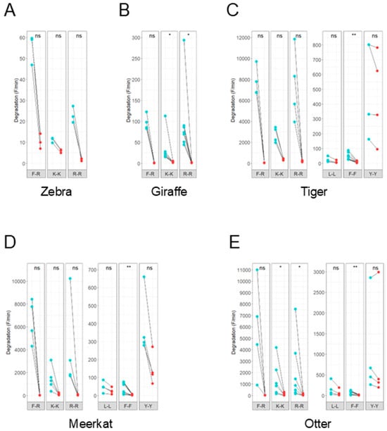 Effect of serine protease inhibitor benzamidine (BAM) on fecal proteolytic activity. Line plots showing the degradation (F/min) of fluorescent peptide substrates before (blue) and after (red) addition of 5 mM BAM. The effect of BAM on the proteolytic activity of feces from animals with different dietary requirements was analyzed: zebra (A), giraffe (B), tiger (C), meerkat (D) and otter (E). Adding BAM led to a decrease in substrate degradation with varying significance values. A pairwise Wilcoxon signed-rank test was performed. Activity was measured in triplicate. Significance levels are depicted with asterisks: ns: no significant difference, * p < 0.05, ** p < 0.01.