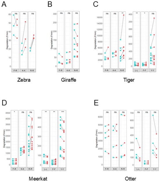 Effect of metalloprotease inhibitor ethylenediaminetetraacetic acid (EDTA) on fecal proteolytic activity. Line plots show the degradation (F/min) of fluorescent peptide substrates before (blue) and after (red) addition of 10 mM EDTA. The effect of EDTA on proteolytic activity of feces from animals with different dietary requirements was analyzed: zebra (Equus grevyi) (A), giraffe (Giraffa camelopardalis) (B), tiger (Panthera tigris altaica) (C), meerkat (Suricata suricatta) (D) and otter (Aonyx cinerea) (E). No clear effect upon the addition of EDTA was observed. A pairwise Wilcoxon signed-rank test was performed. Activity was measured in triplicate. Significance levels are depicted with asterisks: ns: no significant difference, * p < 0.05, ** p < 0.01, *** p < 0.001.
