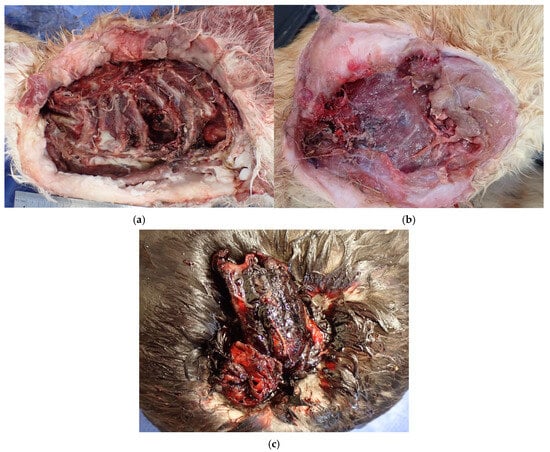 Wound sites in the three cases subjected to mtDNA analysis. (a) Case 1: Left thoracic region of a cat. The left forelimb is missing. The first to eighth ribs are exposed at the wound site, with hemorrhagic soft tissue remaining around the area. Multiple ribs exhibit fractures or loss of bone. (b) Case 2: Right thoracic region of a cat. The right forelimb is missing. Muscle tissue is exposed to the wound site, with surface muscles showing signs of crushing. Some areas surrounding soft tissue exhibit hemorrhage. Multiple rib fractures and bone loss were confirmed internally. (c) Case 3: Cervical region of a duck. The head and the eighth cervical vertebrae are missing. At the wound site, approximately 3 cm of cervical vertebrae and a small amount of surrounding soft tissue protrude. Extensive hemorrhage and blood coagulation are observed in the soft tissue.