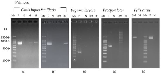 Electrophoresis results of the three cases analyzed in this study. (a) In Case 1, bands were detected from both sample collection methods for the dog test. (b) In Case 2, bands were detected only from the swab sample for the dog test. (c) In Case 3, no bands were detected in the masked palm civet test. (d) In Case 3, no bands were detected in the raccoon test. (e) In Case 3, bands were detected only from the muscle tissue sample in the cat test. Ma: DNA marker; P: positive control; N: negative control; 1–3M: muscle tissue samples from Cases 1–3; 1–3S: surface swab samples from Cases 1–3.