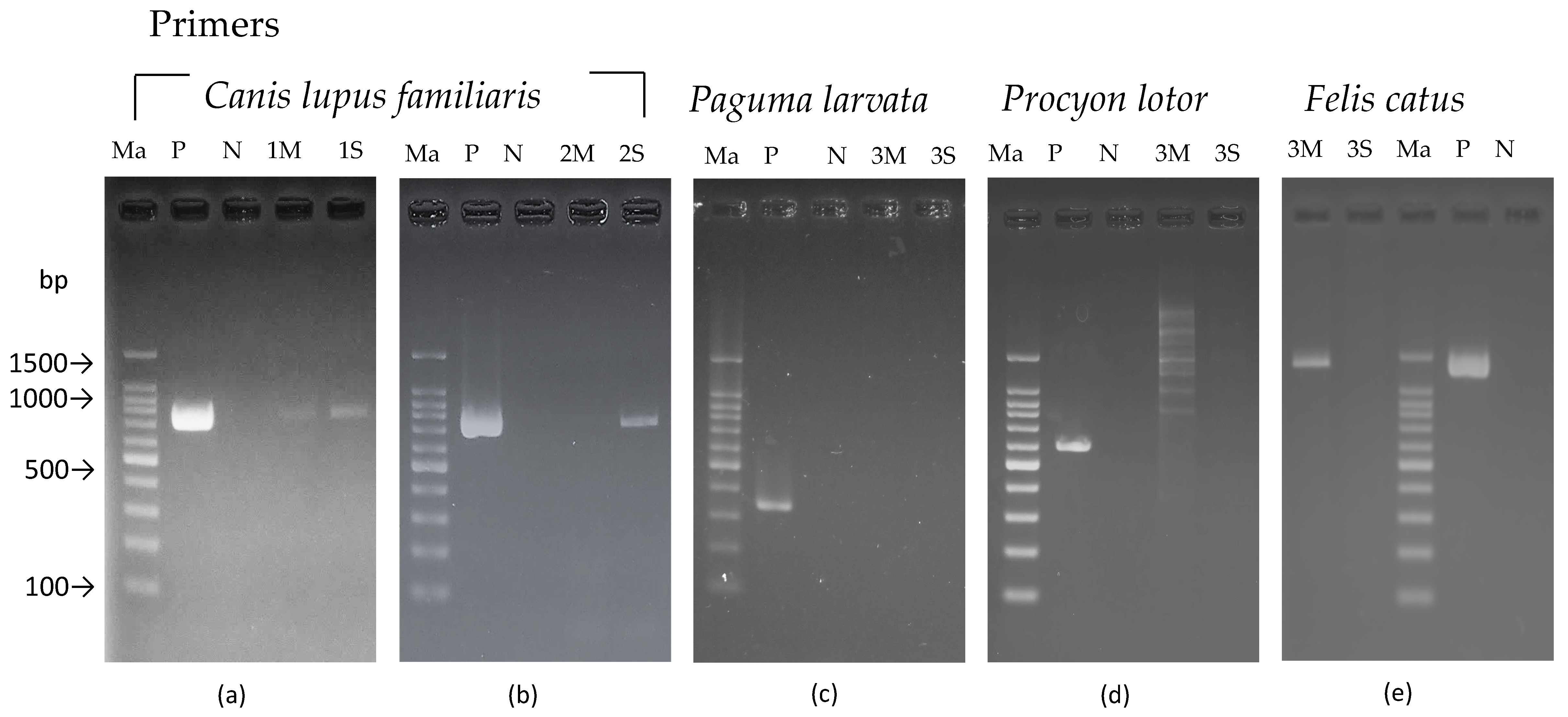 | Procyon lotor | PLO-L15997 | CCATCAGCACCCAAAGCT [19] | PLO-CRL1 | CGCTTAAACTTATGTCCTGTAACC | 608 |