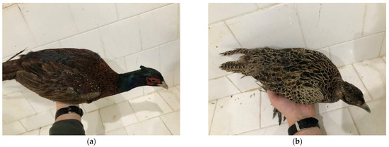 Clinically healthy Black-necked pheasants (Phasianus colchicus) without manifestation of cannibalism from group I (a) male pheasant; (b) female pheasant.