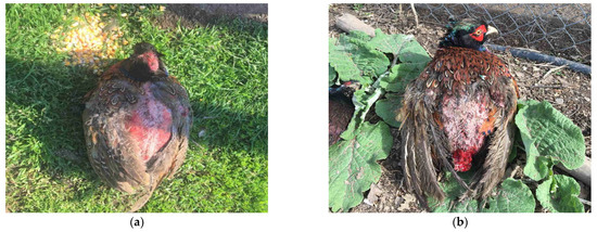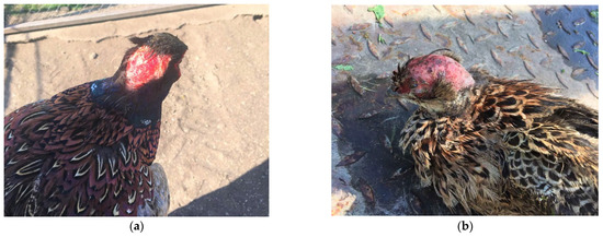 (a) Male Black-necked pheasant (Phasianus colchicus) with signs of improvement from severe feather pecking and tissue pecking from group III after treatment with silymarin; (b) female pheasants (Phasianus colchicus) with signs of improvement from severe feather pecking and tissue pecking from group III after treatment with silymarin.