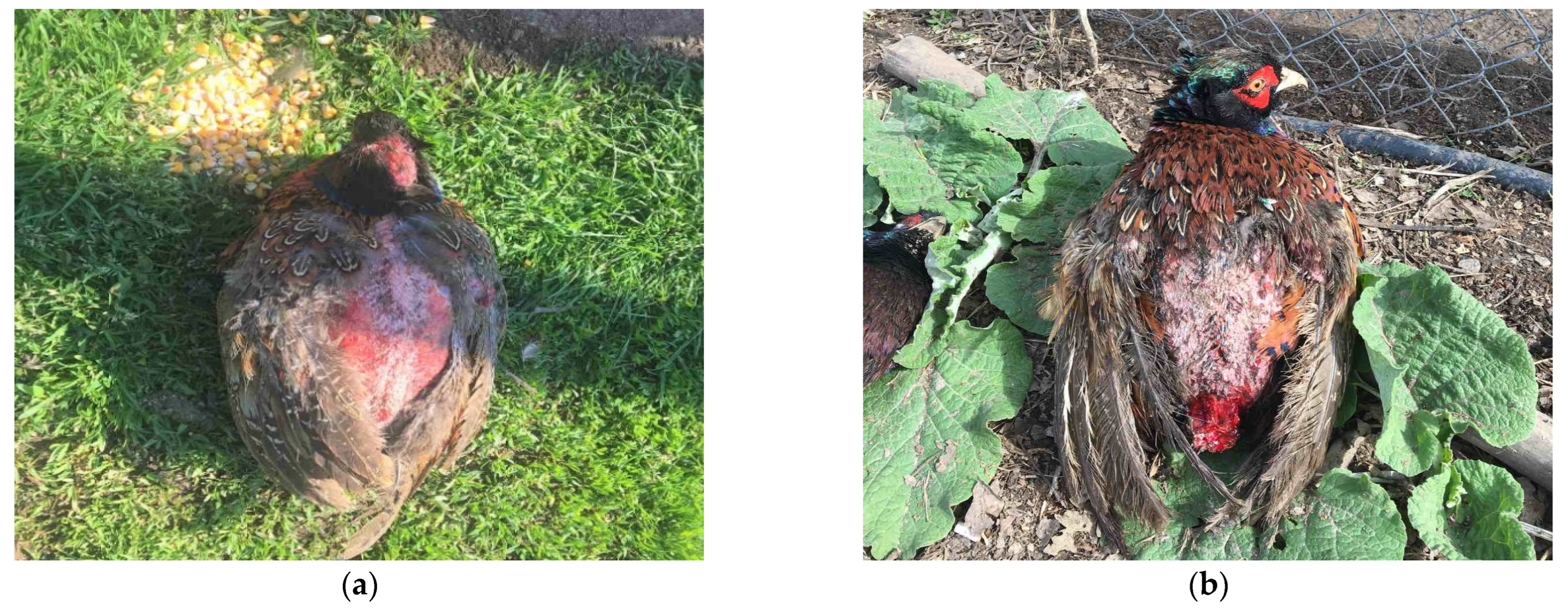 - Kjaer, J.B. Effects of stocking density and group size on the condition of the skin and feathers of pheasant chicks. Vet. Rec. 2004, 154, 556–558. [Google Scholar] [CrossRef]