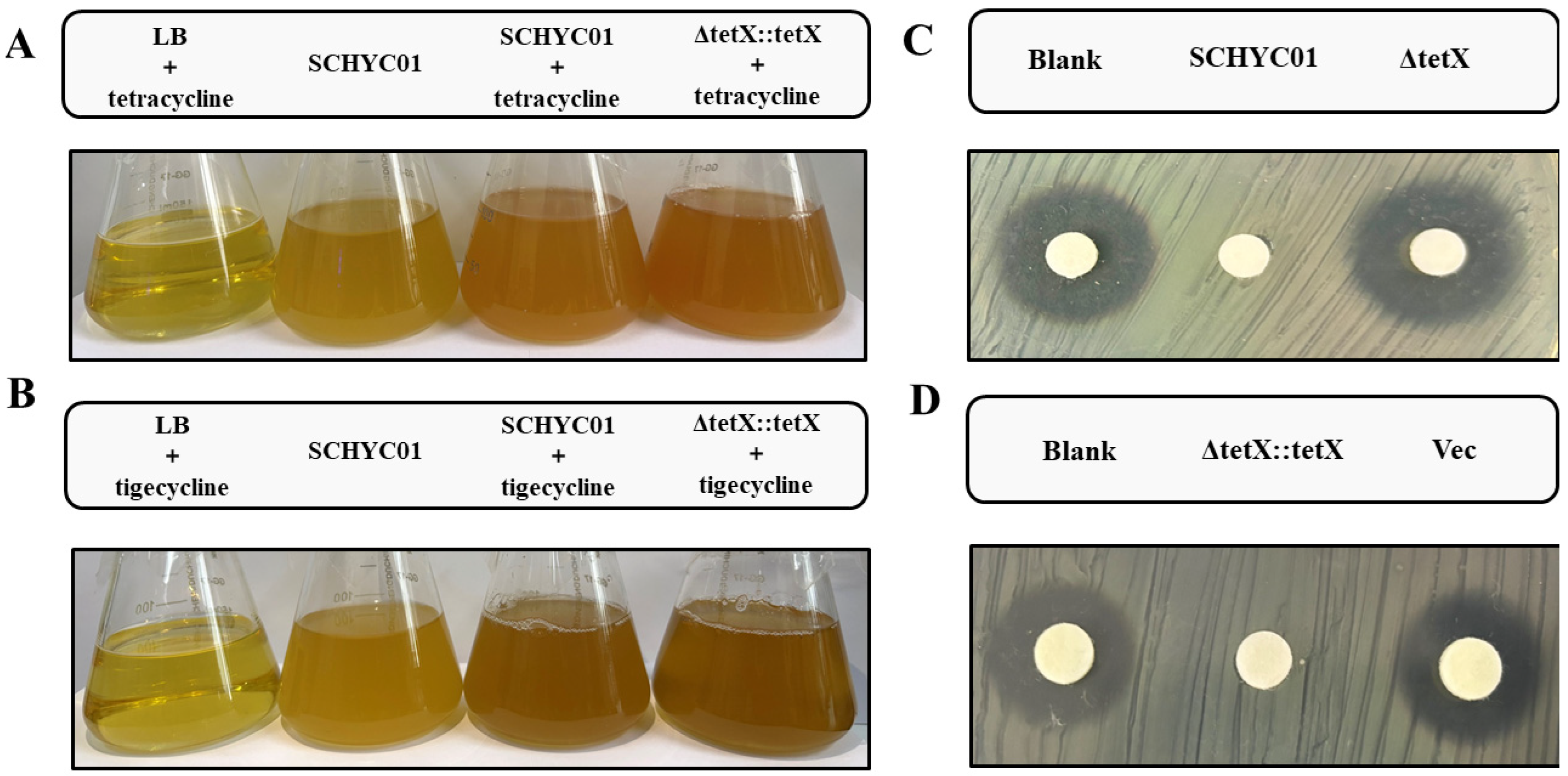 3.2. Determination of Antibiotic Susceptibility in Strains SCHYC01, ΔtetX, and ΔtetX::tetX