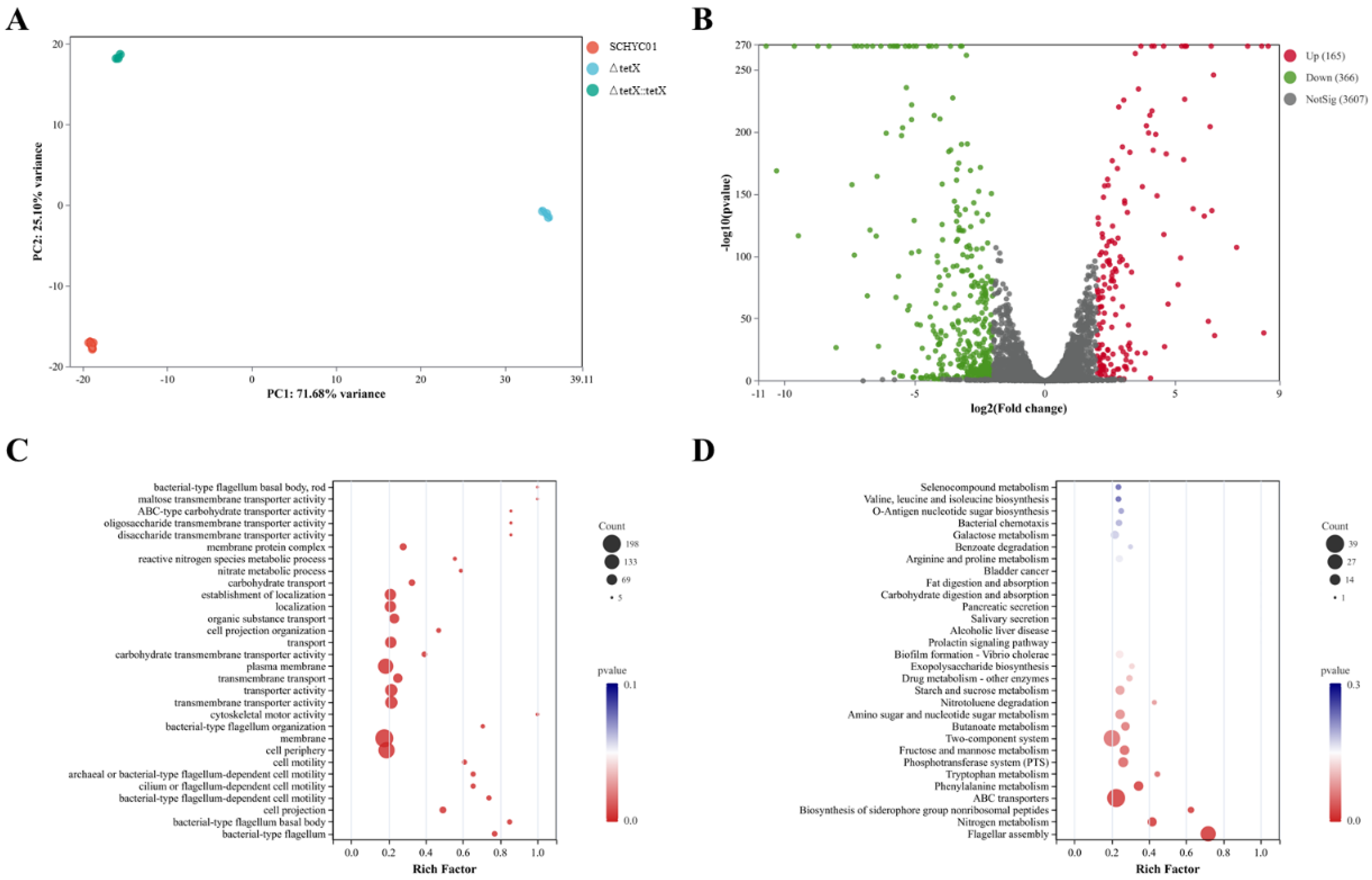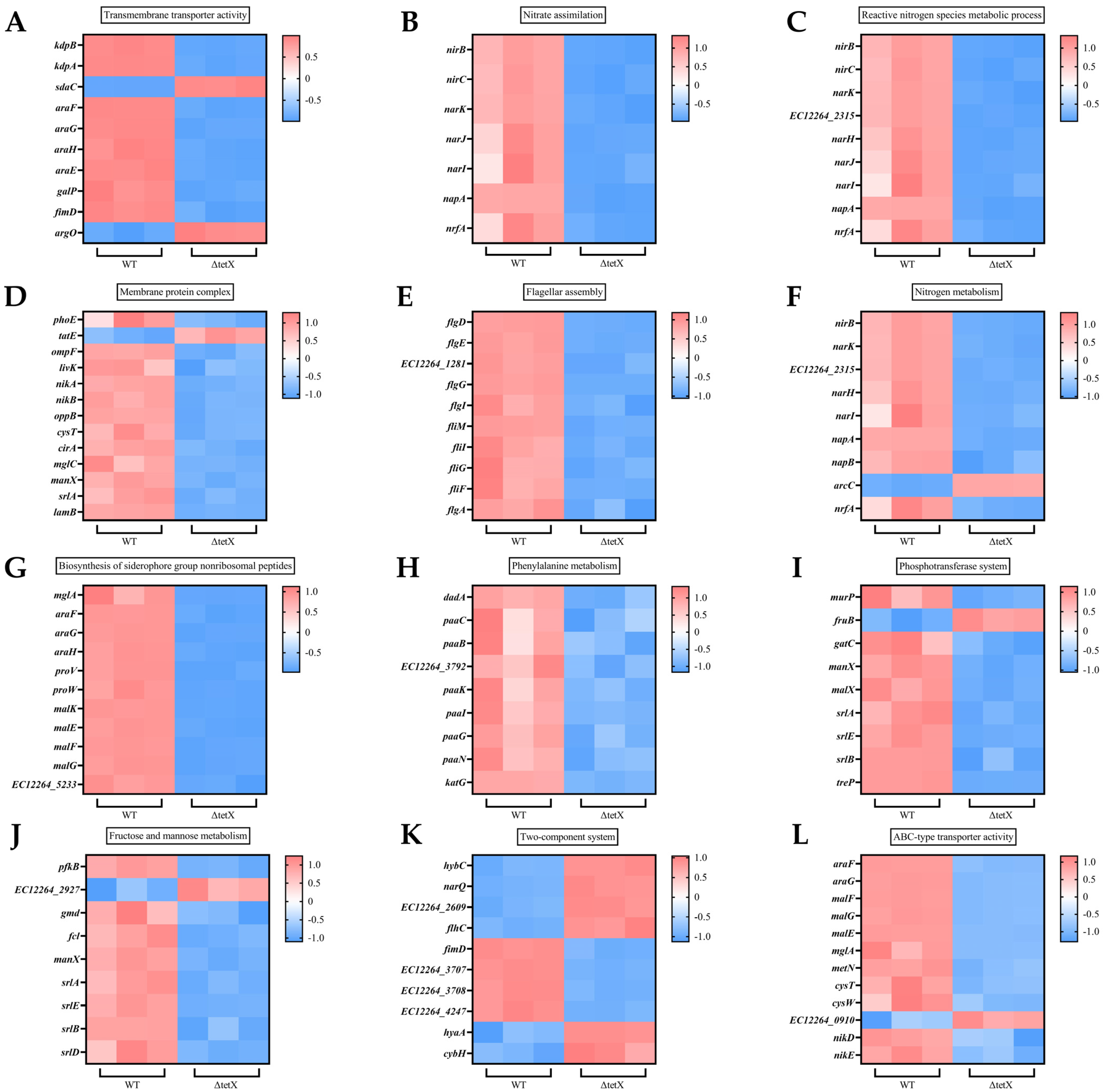 3.6. Effect of tet(X4) Gene Deletion on Global Regulatory Functions in E. coli and RT-qPCR Validation of Transcriptomic Data