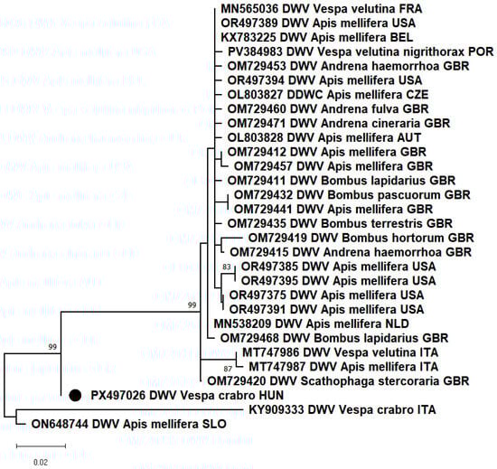 PCR results showed that most of the samples from Kiskunlacháza and Vácduka were positive for the deformed wing virus (DWV). This is the first confirmed detection of DWV in apparently healthy V. crabro workers in Hungary. Previously, such cases had only been reported in Italy [9,10]. In other studies, DWV is described as one of the most frequently isolated viruses in both adults and larvae of Vespa orientalis [7,8]. The partial RdRp segment of our sample showed 97.21% nt identity with the closest reference sequence (ON648744), which was detected in Apis mellifera from Slovenia. Our sample showed only 90.52% nt identity with the other DWV detected in Vespa crabro. In the phylogenetic analysis, the DWV_HUN-1 (PX497026) strain clustered in a separate branch (Figure 1).