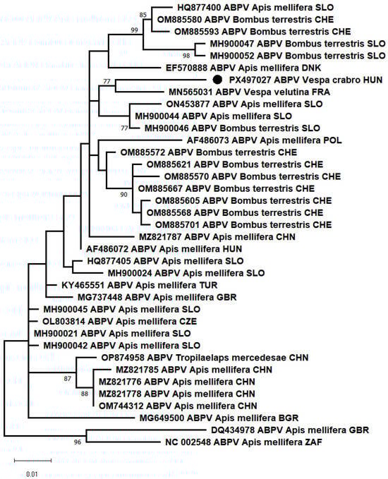 Additionally, PCR results showed that most of the samples from both collection sites were positive for the acute bee paralysis virus (ABPV), marking the first detection of ABPV in healthy V. crabro workers. In other research, the genetic material of ABPV was detected with a frequency of 17.2% in larvae and 63.3% in adults of the species Vespa orientalis [7,8]. The partial RdRp of our sample showed 97.08% nt identity with the closest reference sequence (MN565031), which was detected from the Asian hornet (Vespa velutina nigrithorax, Buysson, 1905). In the phylogenetic analysis, the ABPV_HUN-1 (PX497027) strains clustered together with the closest reference sequences (Figure 2).