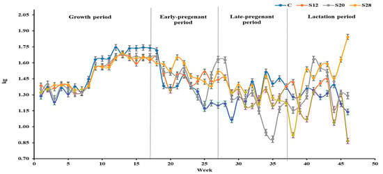 Mean dry matter intake (kg/d) of Naemi ewes during the different experimental periods. n = 21; Treatments C, S12, S20, and S28 represent complete pelleted diets supplemented with 0%, 12%, 20%, and 28% sunflower hulls, respectively.