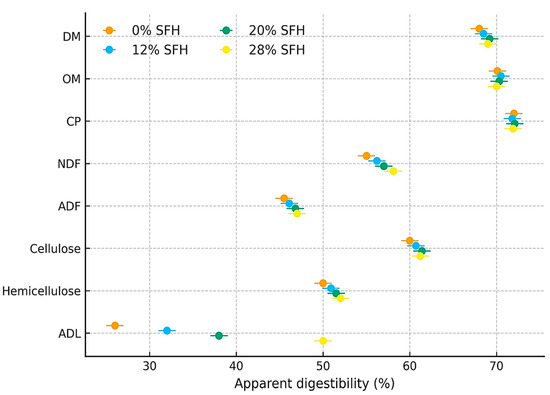 Digestibility coefficients are summarized in Figure 2. Although dry matter and major fiber fractions (NDF and ADF) did not differ significantly among treatments (p > 0.05), meaningful patterns emerged with increasing SFH. Ewes fed the 28% SFH diet exhibited nearly double the apparent digestibility of ADL (50%) compared with the other groups, indicating a marked adaptive response of rumen microbes to the lignin-rich substrate. Numerical increases in NDF and ADF digestibility in the 28% SFH group further support enhanced microbial engagement with more recalcitrant fiber fractions, even if these differences did not reach statistical significance. Taken together, these findings suggest that moderate-to-high SFH inclusion may promote gradual microbial adaptation to lignocellulosic material.