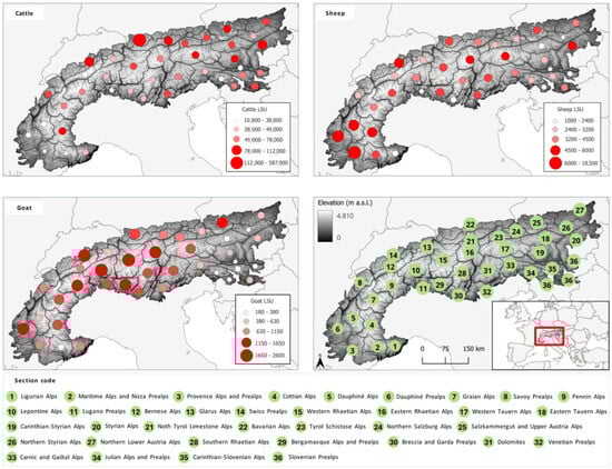 The distribution of cattle, sheep, and goat density in the 36 Alpine subregions is presented in Figure 1.