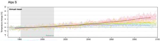 Simulated evolution of the mean annual temperature anomaly [°C] with respect to the 1981–2010 mean value (Reference period, grey area) and averaged over the Southern Alps (Alps S). Line colors refer to the different emission scenarios (for details, see [39]). Licensed under CC BY 4.0, https://creativecommons.org/licenses/by/4.0/, accessed on 8 December 2025.