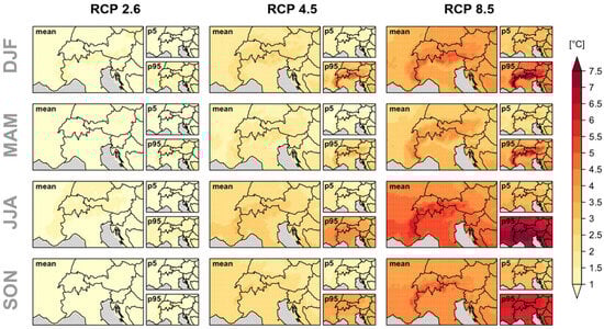 Projected seasonal mean temperature change between 1981–2010 and 2070–2099 over the Alpine region for three greenhouse gas emission scenarios (for details, see [39]). Licensed under CC BY 4.0, https://creativecommons.org/licenses/by/4.0/, accessed on 8 December 2025.