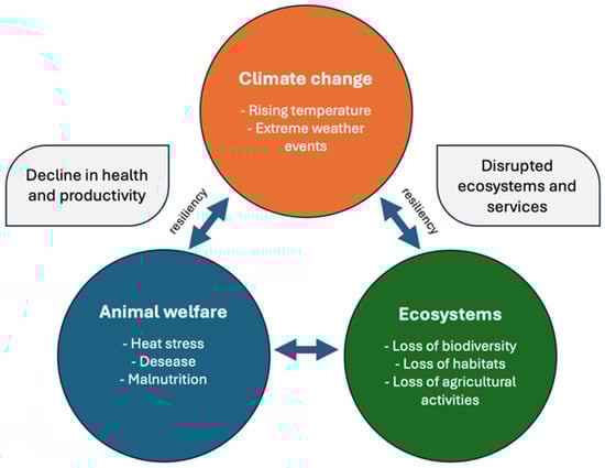 Climate change poses a significant challenge to ecosystems worldwide, influencing biodiversity and reshaping the living conditions of both wild and domesticated animals. This intersection of environmental change, biodiversity loss, and animal welfare creates a complex triad with mutual feedback. Understanding these dynamics is essential for building sustainable agricultural systems, conserving biodiversity, and promoting ethical standards of animal husbandry. Thus, environmental protection is essential for enhancing global resilience in the face of increasing uncertainties. Within the European Community, this priority has grown due to the strategic role ecosystems play in providing critical services like food production, carbon storage in soils, and biodiversity conservation [104,105].