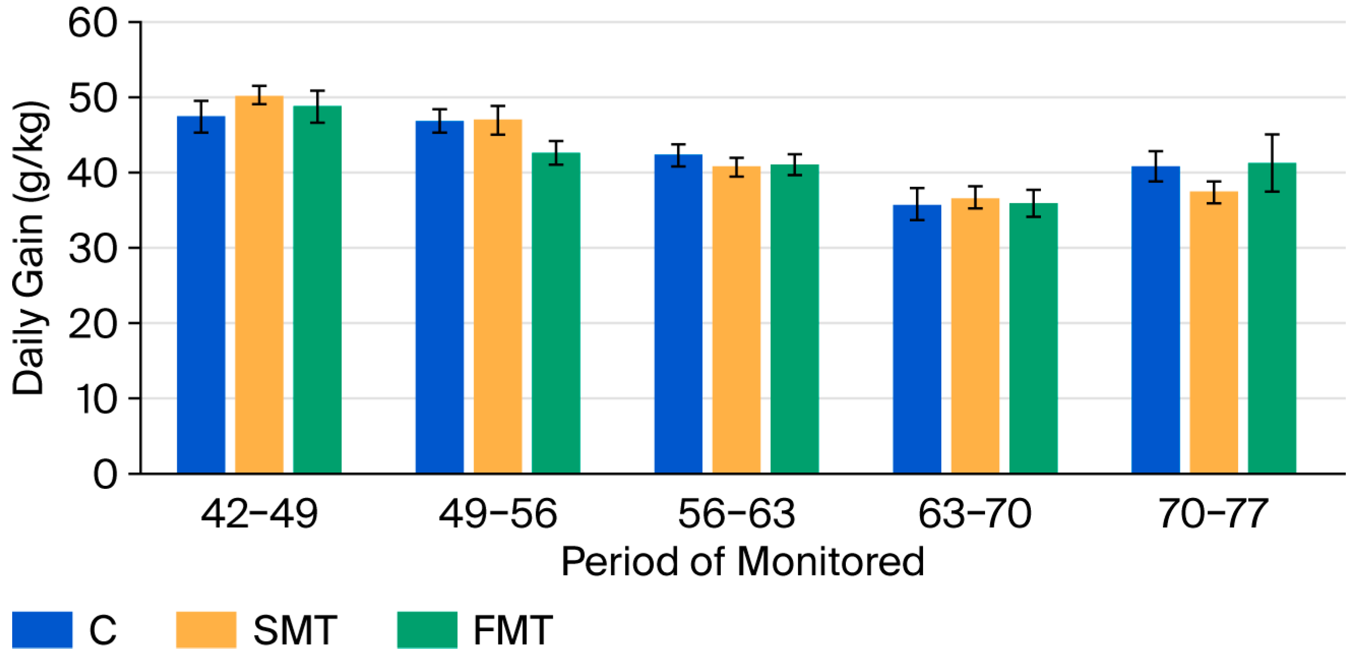 | Period | C (g/kg/Week) | SMT (g/kg/Week) | FMT (g/kg/Week) | |||