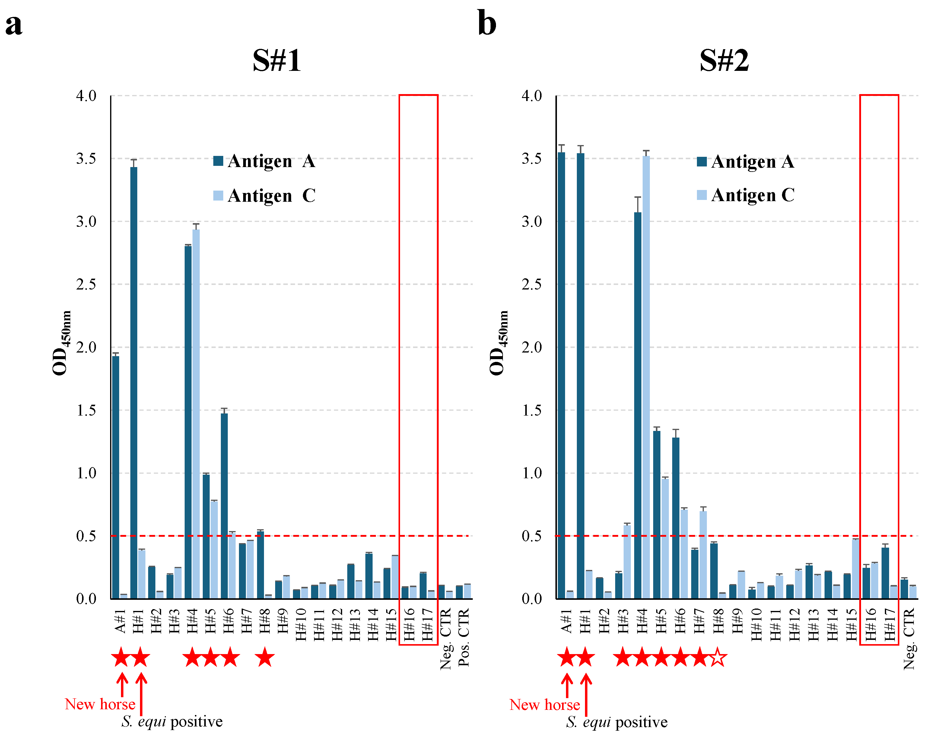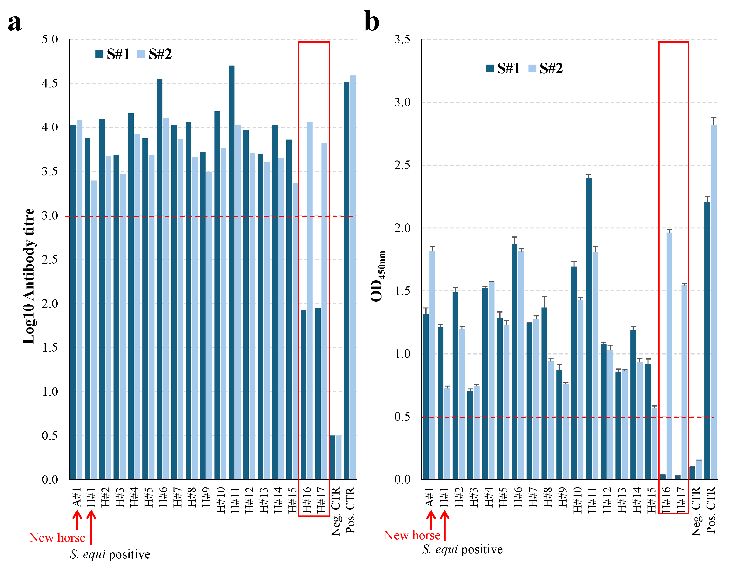 - Robinson, C.; Steward, K.F.; Potts, N.; Barker, C.; Hammond, T.; Pierce, K.; Gunnarsson, E.; Svansson, V.; Slater, J.; Newton, J.R.; et al. Combining Two Serological Assays Optimises Sensitivity and Specificity for the Identification of Streptococcus Equi Subsp. Equi Exposure. Vet. J. 2013, 197, 188–191. [Google Scholar] [CrossRef]