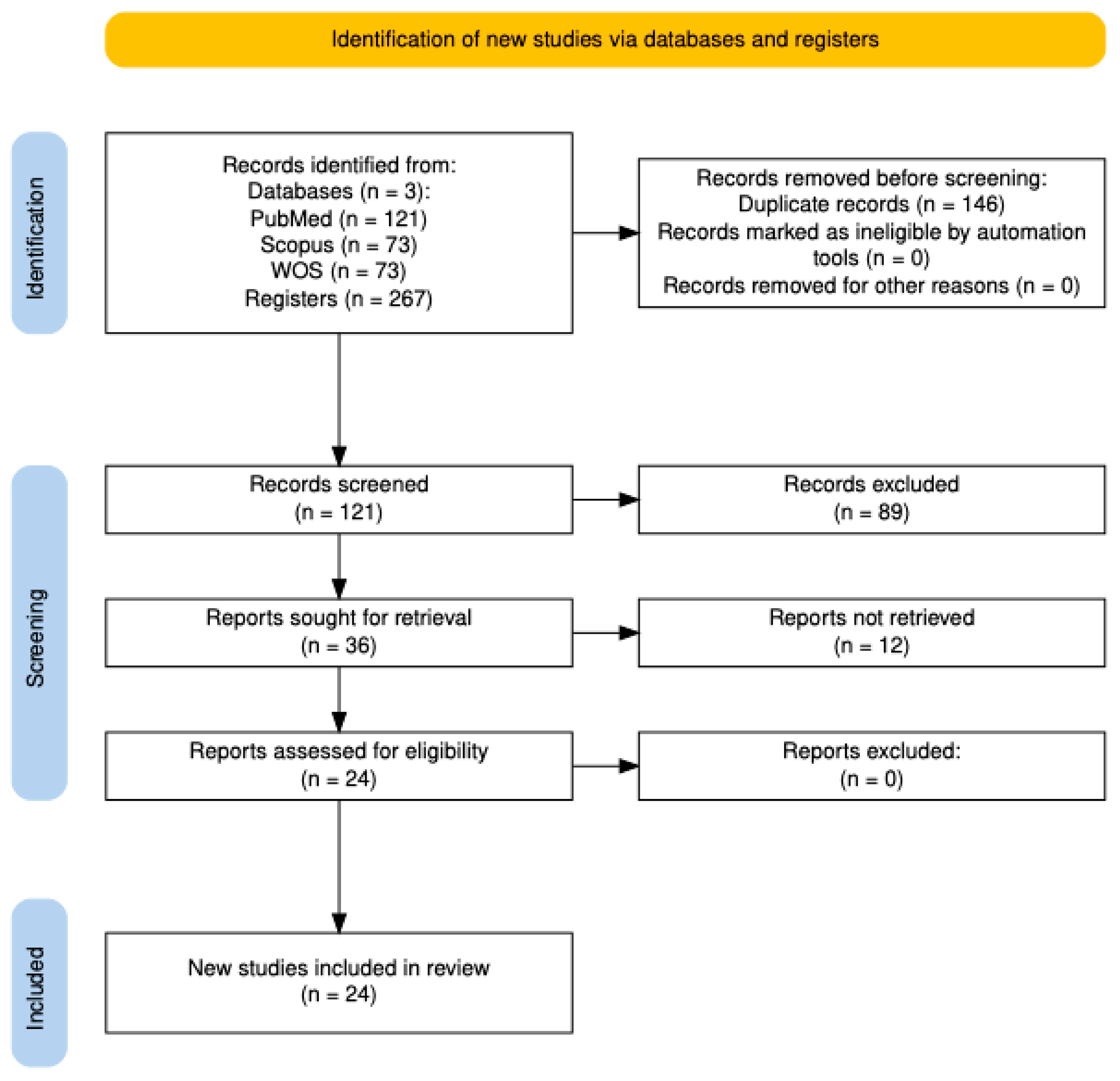A total of 267 records were initially identified through database searches in PubMed (n = 121), Scopus (n = 73), and Web of Science (n = 73). After removing 146 duplicates, 121 unique records were screened. Following a software-assisted screening of titles and abstracts, 89 records were excluded, leaving 36 reports for full-text review. Of these, twelve were excluded for the following reasons: three did not report adequate centrifugation protocols [43,44,45]; eight provided incomplete information regarding whole blood [46,47,48,49,50,51,52] or PRP cellular composition [53]; and one focused on an autologous protein solution rather than PRP [54]. Consequently, 24 studies [19,20,55,56,57,58,59,60,61,62,63,64,65,66,67,68,69,70,71,72,73,74,75,76] met the inclusion criteria and were included in the scoping review. Among these, 20 were published in English, while the remaining consisted of four in Portuguese [64,65,70,72], one in German [73], and one in Spanish [76]. The complete study selection process is depicted in the PRISMA 2020 flow diagram (Figure 1).
