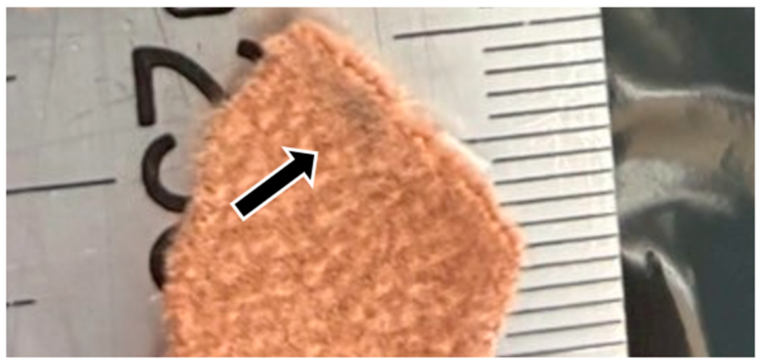 Figure 2). From the outer surface of the trousers, a fabric piece measuring 3 cm (vertical) × 5 cm (horizontal) was collected from a location 5 cm to the right side of the crotch area. In addition, a section measuring 6 cm (vertical) × 3–4 cm (horizontal) was excised from a position approximately 15.5 cm below the right waist. Furthermore, the discolored area, approximately 0.2 cm in diameter, was visually identified immediately below this section, and a fabric piece measuring 1.5 cm (vertical) × 2 cm (horizontal) that included this discolored region was excised.
