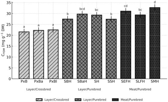 Breed-dependent variation in yolk cholesterol concentration (C_YDM) across ten chicken genotypes (LSM, 95% CI; p = 0.0056). Different letters (a–d) above the bars indicate significant differences at p < 0.05.