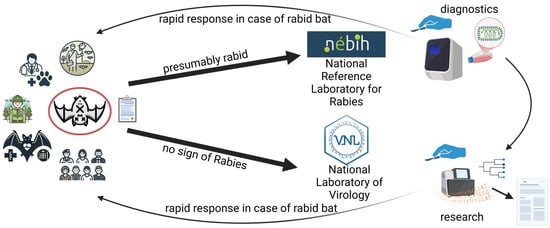 If a bat is suspected of being infected with the rabies virus, it is sent to the National Reference Laboratory for Rabies. Investigations at the National Reference Laboratory for Rabies are conducted promptly, particularly in cases involving potential human exposure. If rabies infection is not suspected, the bat is sent to the National Laboratory of Virology at the University of Pécs. Here, additional viral groups are investigated besides lyssaviruses.