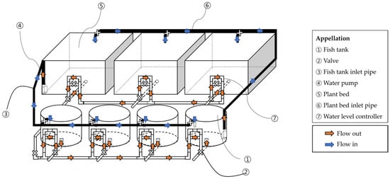 Four experimental groups were established: BFT, RAS, BFT-AP, and RAS-AP. The entire experiment lasted 72 days, consisting of 30 days for microbial inoculation, 14 days for plant seedling preparation, and 28 days for fish and plant rearing. A 2 × 2 factorial design was employed, with two fixed factors: (1) culture system (BFT or RAS) and (2) aquaponic application (with or without AP). A total of sixteen circular fiber-reinforced plastic (FRP) tanks (diameter: 1.5 m; height: 0.6 m; volume: 1.06 m3) were used to culture Japanese eels (A. japonica), with four replicate tanks assigned to each treatment. In aquaponic treatments (BFT-AP and RAS-AP), each fish tank was connected to three rectangular FRP plant beds (width: 2.0 m; length: 2.0 m; height: 0.6 m; volume: 2.4 m3), resulting in six plant beds (three per treatment). Fish were randomly allocated among tanks to minimize potential bias (Figure 1).